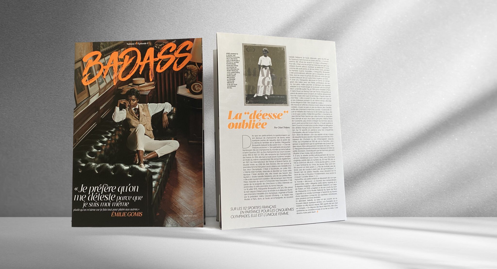Pour sa Saison 1, Épisode 1, « Badass » dribble fort avec, en couv’ et des photos ultra léchées, une sacrée nana du sport féminin – « Je préfère qu’on me déteste parce que je suis moi-même », s’exclame-t-elle en couverture – la joueuse de basket française et médaillée olympique, Émilie Gomis, vêtue façon années 1920. Un hommage stylé, et de circonstance en cette année de centenaire et de parité Olympique, aux Françaises médaillées en 1912 et en 1924 à Paris.
