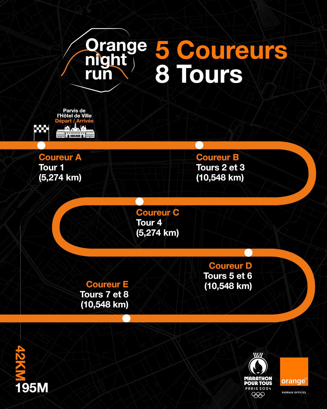 Paris sous le ciel étoilé (en théorie), avec un parcours sous forme de boucle d’une distance de 5 274 kilomètres avec départ et arrivée au Parvis de l’Hôtel de Ville… Huit tours sont à boucler pour chaque équipe.